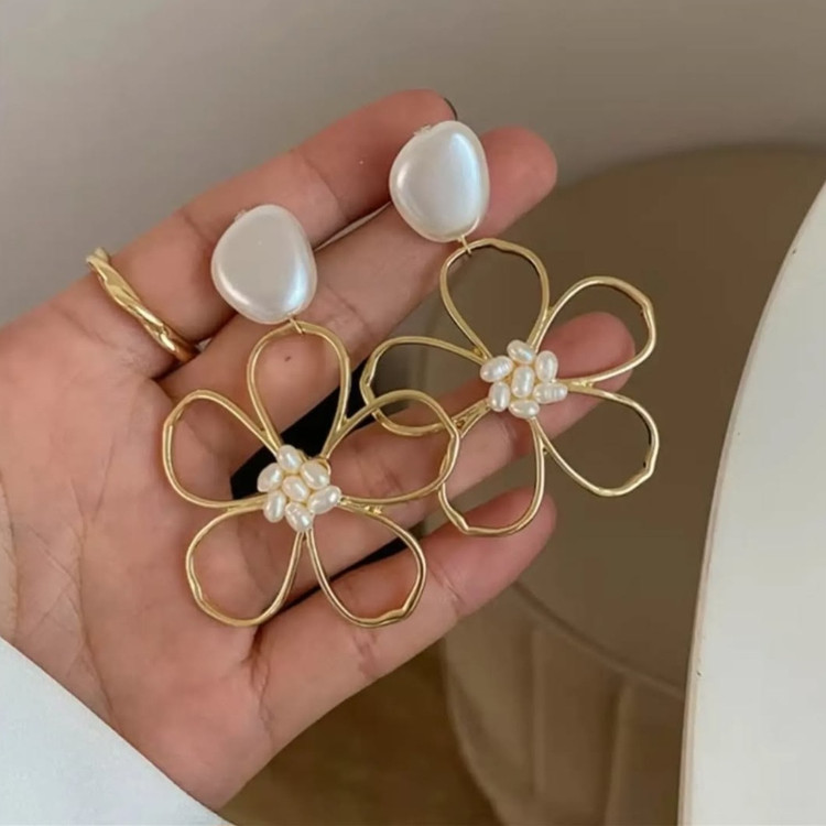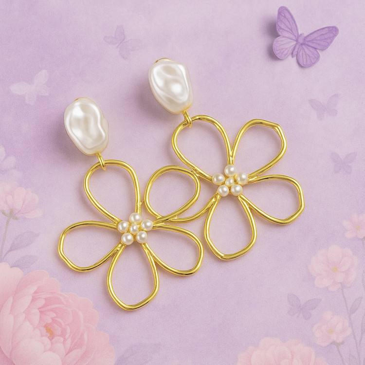 گوشواره گل و مروارید طلایی جلوه ای خاص به استایل شما می بخشد.