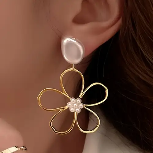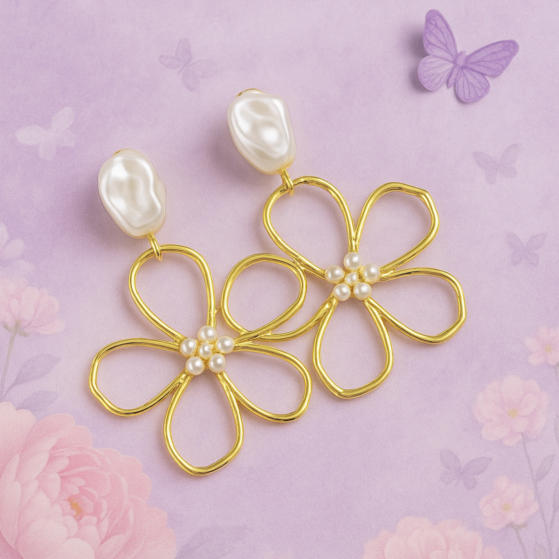 گوشواره گل و مروارید طلایی جلوه ای خاص به استایل شما می بخشد.